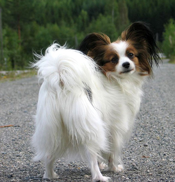 Papillon’un sırtta kıvrık taşınan uzun ve tüylü bir kuyruğu vardır. Bu nedenle Papillon’a bir zamanlar Sincap Spaniel denirdi. Uzun gösterişli beyaz kürkün üzerinde kızıl hariç her renkten lekeler görülür. Beyaz kürkün üzerindeki lekeler her iki gözü ve kulağı da önlü arkalı kaplamalıdır. Kelebek benzeri kulakları ya dik ya da düşük taşınır. Bu tür kulaklara Phalene denir. Belirgin bir beyaz burun bantı vardır. Zeki ve dikkatli bir ifadeye sahiptir. Papillon’un burun kısmı kısa ve çok az sivridir.